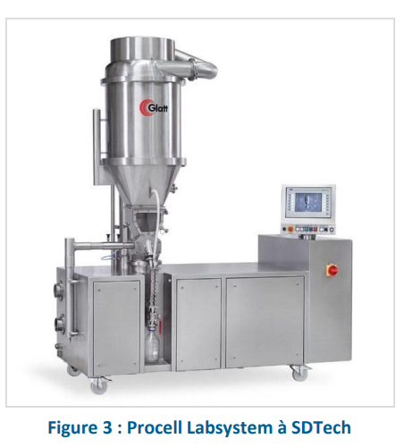 Pour les prestations de granulation en lit d’air fluidisé, SDTech est équipée d’un Procell Labsystem de Glatt. Il s’agit d’un équipement pilote fonctionnant en mode batch ou continu permettant de produire quelques kilos par jour.