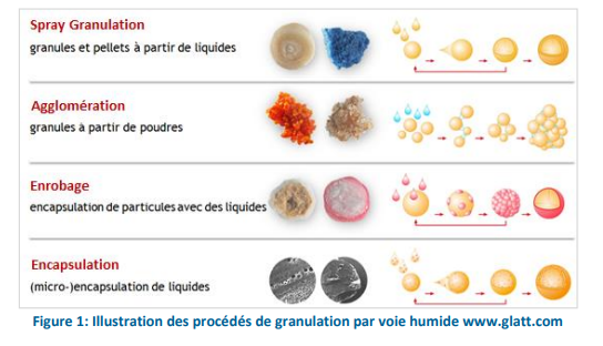 La « Granulation » inclut tout procédé de mise en forme permettant d’assembler des fines particules pour former des grains de quelques centaines de micromètres jusqu’à plusieurs millimètres.